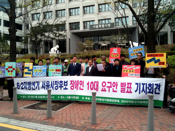 서울지방선거장애인연대는 22일 오전 11시 서울 시청별관 앞에서 기자회견을 열고 ‘6.2지방선거 서울시장 후보 장애인 10대 요구안’을 발표했다.