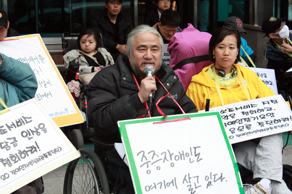 박홍구 한국장애인자립생활센터협의회 회장은 “모 언론에 어제 OECD국가 중 우리나라가 GDP대비 장애인복지예산이 꼴찌라는 기사가 나왔다. 기사 내용처럼 OECD 평균이 1.2%라는데 우리는 0.1%밖에 안 된다고 한다. 이명박대통령이 지난 10년간 복지예산이 꾸준히 증가됐다고 말하지만 장애인복지예산은 1990년대에도 0.1%, 2000년에도 0.1%, 2010년에도 0.1%다. 도대체 뭐가 늘었다는 건가.”라고 비판했다.