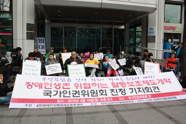 420장애인차별철폐공동투쟁단(이하 420공투단)은 19일 오후 국가인권위원회 앞에서 활동보조 제도개악의 피해사례를 모아 정부에 의한 장애인생존권 탄압의 실상을 폭로하고, 인권위에 그 피해사례를 진정하기 위한 기자회견을 개최했다.