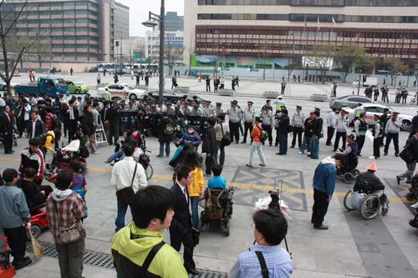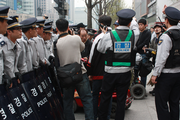 횡단보도 앞에서 경찰에 의해 막힌 장애인들은 "다른 비장애인들은 다 지나가게 하면서 우리만 막는 이유가 뭐냐. 우리는 대한민국 국민도 아니란 말이냐."며 강하게 항의했다.