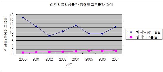 하지만 노동수요는 임금수준에 따라 장기적(長期的)으로 변하므로 분석기간을 되도록 길게 잡아야 정확한 고용효과를 알 수 있다는 논거(Ehrenberg and Smith, 2000)에 따르면 상황은 달라진다. 본 연구에서 장애인 최저임금의 중장기적 고용효과를 파악하기 위해 우리나라의 과거 8년간(2000~2008년) 최저임금 인상률과 장애인고용률과의 관계를 살펴본 결과 양자 간의 관련성은 거의 발견되지 않은 것으로 나타났다(<그림1> 참조).