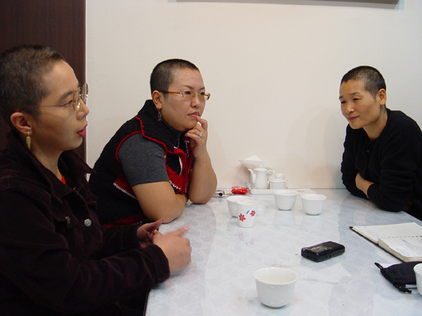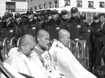 | 2004년 10월 28일 당시 서울장애인교육권연대에서 활동하던 김경애, 김혜미, 박문희 활동가가 서울시교육청 앞에서 장애인교육예산 6% 확대 등을 주장하며 삭발을 감행했다 (함께걸음 자료사진) | ||