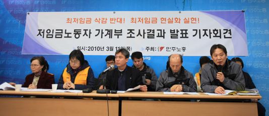 민주노총은 11일 신 씨나 박 씨처럼 최저임금을 받는 노동자들에 대한 가계부 조사결과를 발표했다. 이번 조사는 저임금노동자 14명이 작년 12월부터 1월까지 두달 간 직접 작성한 가계부를 분석했다. 가계부 분석에 참가한 이들은 서울 3, 대구 3, 인천 2, 경남 1, 울산 1, 대전 1, 충북 1, 충남 1, 광주 1명 등으로 민주노총 최저임금대책회의에 결합하는 공공운수연맹, 여성연맹, 일반노협이 인구비례 지역할당으로 표본을 선정했다.