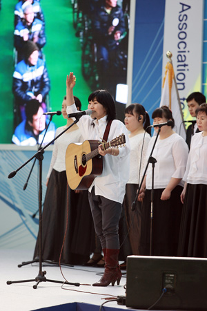 | ▲ 식전축하공연으로 가수 박강수가 초청되어 한빛 예술단 체리티 합창단과 함께 노래를 부르고 있다. ⓒ이준호 객원사진기자 | ||