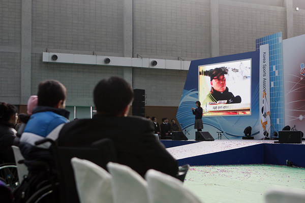 | ▲ 영상을 통해 방송인 및 시민들이 제7회 전국장애인동계체육대회 개최에 축하 메세지를 보내왔다. ⓒ이준호 객원사진기자 | ||