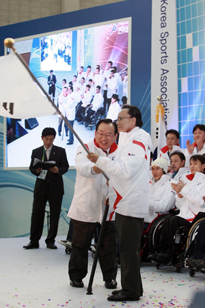 | ▲ 윤석용 대한장애인체육회 회장과 김무성 밴쿠버장애인올림픽 대표팀 단장이 대표팀 단기 전달에 이어 함께 흔들어 보이고 있다. ⓒ이준호 객원사진기자 | ||