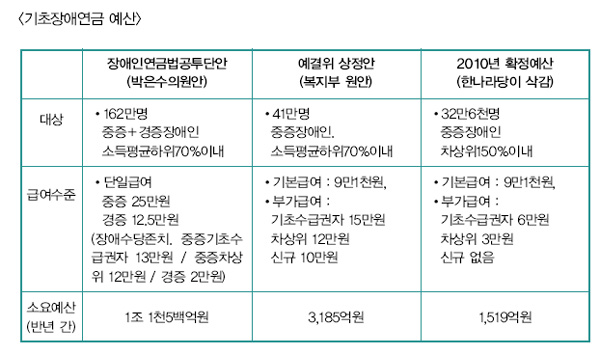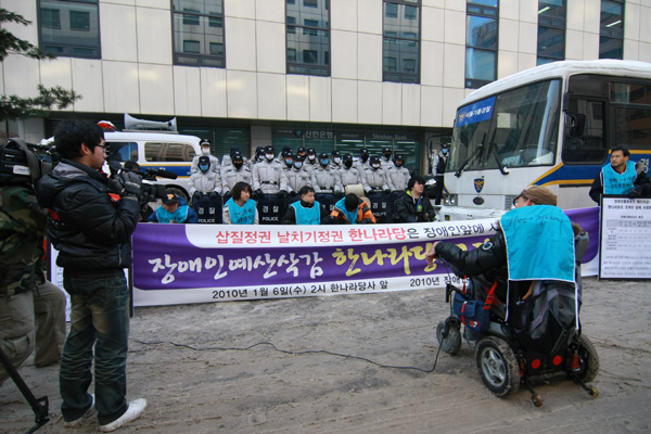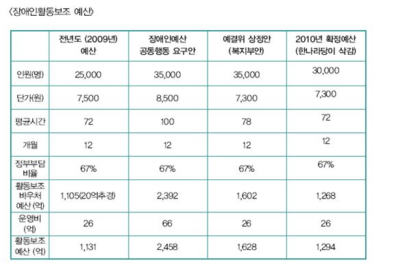 하지만, 장애인의 사회적 추가비용에도 미치지 못하는 장애연금예산과 자연증가분에도 미치지 못하는 활동보조예산, 법정기준에도 미치지 못하는 저상버스예산, 개념도입조차 거부한 탈시설초기정착금과 장애여성출산장려금 등 한나라당의 날치기 예산처리는 더 이상의 장애인복지는 없다는 선전포고와도 같은 것이다.