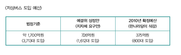 2009년 말 현재 전국적으로 저상버스는 고작 2천370대에 불과해 정부의 계획과 법정기준을 지키기 위해서는 약1천700억 원의 예산이 요구되는 상황이었다. 그러나 계획 이행에 대한 중앙정부의 의지가 없는 상황에서 각 지자체가 고작 726억 원의 예산편성을 요구하였고, 그것을 한나라당이 날치기로 반토막내어 고작 375억 원으로 결정된 것이다.