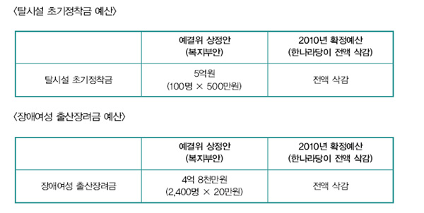 탈시설 초기정착금과 장애여성 출산장려금 예산은 예산규모는 크지 않으나, 장애인의 자립생활을 지원하고 장애여성의 권리를 보장한다는 면에서 상징적인 의미는 매우 높은 사업이었다. 그러나 한나라당의 예산 날치기 과정에서 모두 날아갔다. 말로는 자립생활패러다임을 이야기하는 정부가 실제로는 장애인의 자립생활의 꿈을 무참히 짓밟고 있는 것이다.
