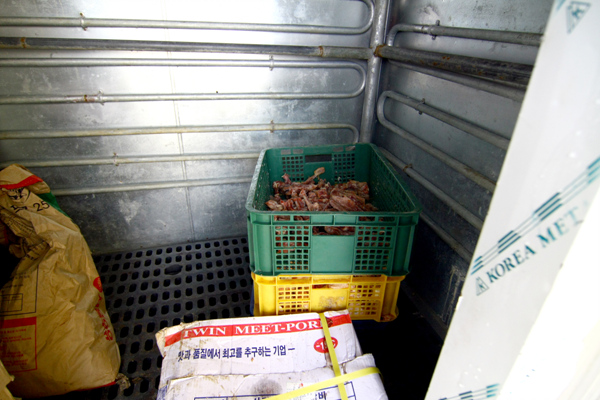 ▲ 시설에서 키우고 있는 풍산개의 먹이로 이용하고 있는 오리고기. 냉장고에 별도로 보관하고 있었다. ⓒ전진호 기자