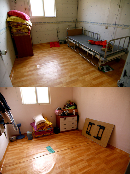 | ▲ 생활인들의 생활공간. 10여년이 넘는 세월동안 생활했던 공간이라고는 믿기지않을만큼 개인물품은 전무했으며, 이 작은 방에서 3~4명이 생활하고 있었다. 방마다 창문은 있었으나 커튼 등이 없어 방 밖에서 내부를 훤히 들여다볼 수 있어 사생활은 전혀 보장되지 않는 구조였다. ⓒ전진호 기자 | ||