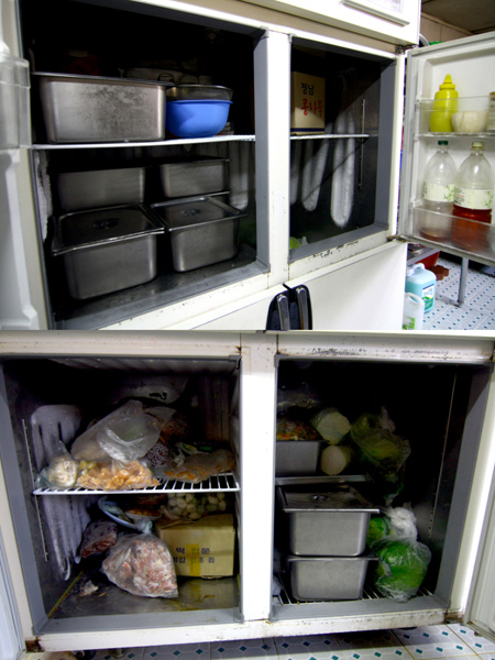 ▲ 생활인 43명의 찬거리를 보관하고 있는 냉장고. 43명의 부식을 보관하기에는 너무도 부족해 보였으나 냉장고 외의 다른 보관창고는 전혀없는 것으로 확인됐다. ⓒ전진호 기자