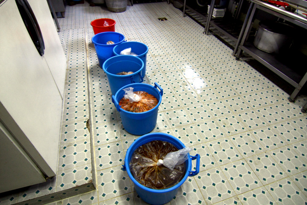 ▲ 인근 초등학교 3곳에서 얻어온 반찬과 국. 이 반찬을 이용해 저녁식사를 제공하고 있었다. ⓒ전진호 기자