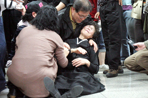 | 용산참사 피고인들에게 중형이 선고되자 통곡하는 고 이상림 씨의 부인 전재숙 씨. 전재숙 씨는 6년 형을 받은 이충연 용산철거민대책위원회 위원장의 어머니이기도 하다. | ||