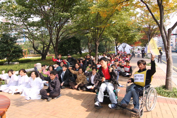 이들은 또 "옹기문화엑스포에 150억원이 넘는 예산을 투입하고서도 행사를 못해 천문학적인 시민혈세를 허공에 날려버렸다"며 "전시성 행사와 온갖 축제에 허비하는 예산의 백분의 일만 장애인복지에 투입했더라도 우리가 한달 보름이 넘는 시간동안 극한투쟁을 하지 않았을 것"이라고 덧붙였다.
