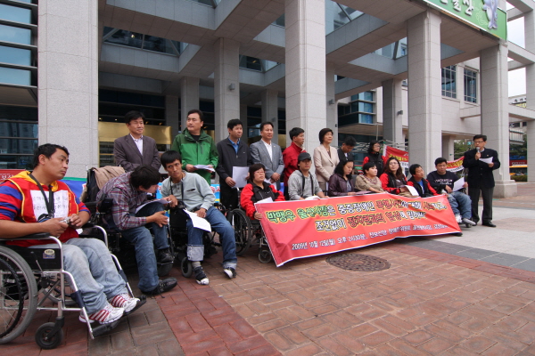 진보신당울산시당은 12일 오후 2시30분 울산시청 본관 앞에서 기자회견을 열고 지난 9일 새벽 울산시 공무원에 의해 저질러진 중증장애인 폭행사건에 대해 박맹우 울산시장이 공식 사과하고 조건없이 장애인차별철폐연대와 협상에 임할 것을 촉구했다.
