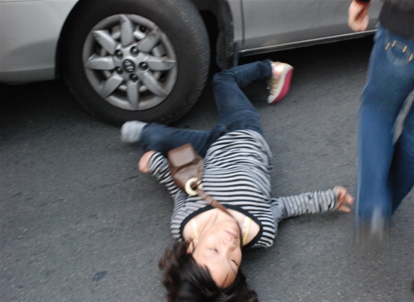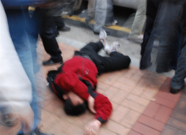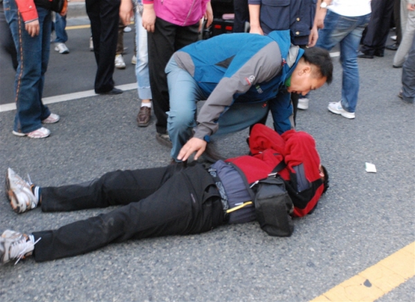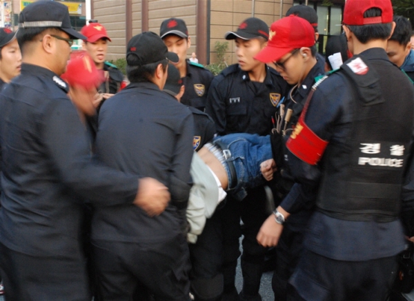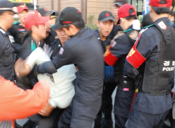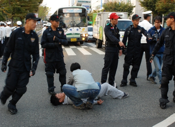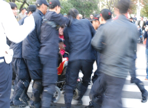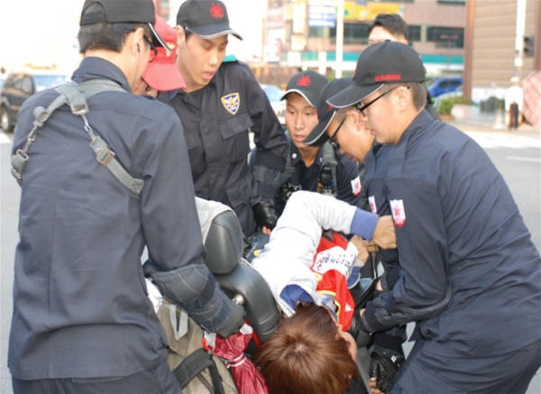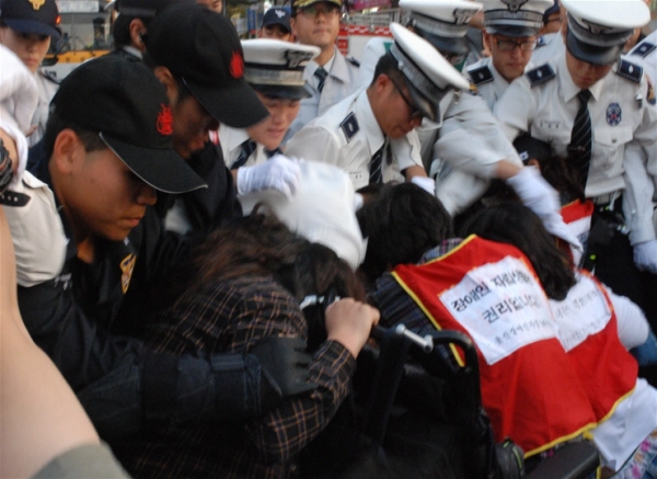 ‘장애아 부모 구속, 2008년 합의사항 불이행, 중증장애인 폭행 울산시청 규탄 전국집중결의대회’가 끝난 직후 집회참석자 300여명이 울산시의 성의 있는 대화를 요구하며 울산시청 사거리 차도를 점거하고 나서자 경찰이 강경진압에 나서 피해자들이 속출하고 있다.