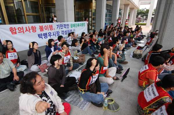 장애인 부모들은 오후 2시 박맹우 울산시장의 강연이 열리는 북구문화예술회관에서 팻말과 펼침막을 들고 장차련 대표들의 강제연행에 항의하다 5분만에 끌려나가기도 했다.