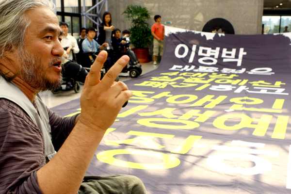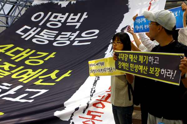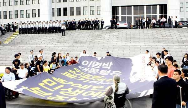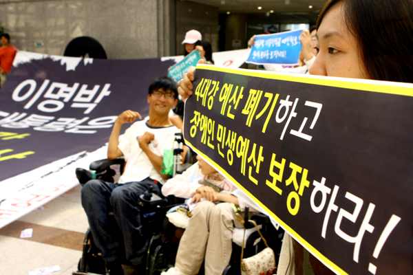 박경석 대표는 구체적인 예로 “교통약자편의증진법에 의해 2010년까지 저상버스를 도입하기 위해서는 1천800억 원이 소요되지만 소문으로는 2~300억 원밖에 책정되지 않았다. 또 선생이 있어야 학교가 있고 학생이 있을 텐데 특수학교 교사를 동결시켜 교육받을 기회를 박탈하고 있는데, 특수교육법에 명시돼 있는 걸 지키기 위해 예산을 편성하라고 주장하는데, 이 사실은 외면한 채 이에 대해 항의하는 사람들만 잡아가고 있다.”고 규탄했다.