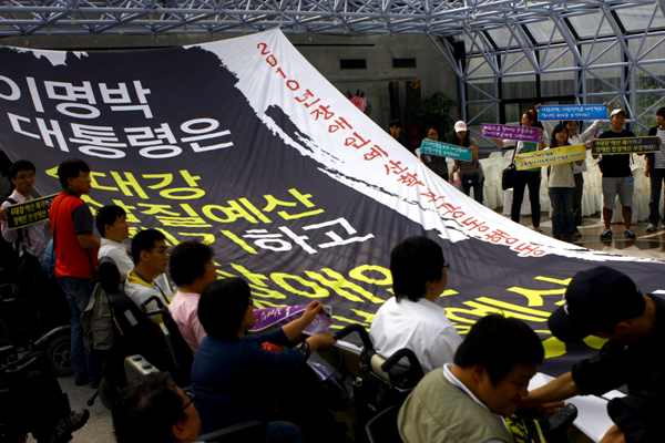 2010장애인예산확보공동행동 소속 회원 50여명은 29일 오후1시 국회 의원회관에서 열린 ‘민생-복지-교육-의료(건강) 예산 증액을 위한 야당, 시민사회, 각계각층 예산 결의대회’가 끝난 직후 의원회관 로비를 1시간가량 점거한 채 농성을 벌였다.