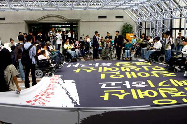 또 박경석 대표는 “장애인예산 문제는 장애인, 돈의 문제가 아니라 인권의 문제.”라며 “목숨을 걸고 싸우기 위해 여기 왔다. 우리의 투쟁만이 삶을 바꿀 수 있기 때문에 열심히 싸울 것.”이라고 말했다.