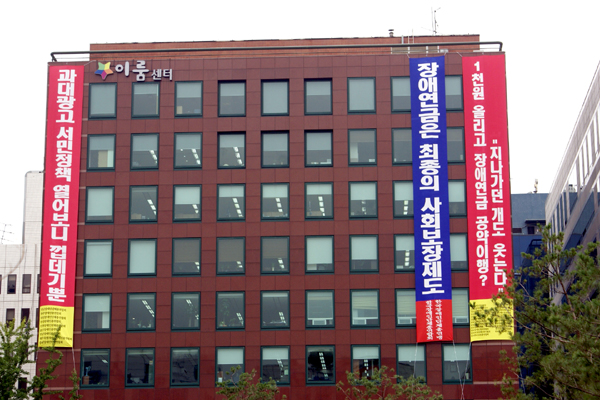 이들은 “아무것도 하지 않고 우두커니 있어야만 간신히 생존 가능한 수준의 장애인 예산을 지금보다 삭감하려는 정부의 태도는 결국 장애인을 생활시설이나 집에만 처박혀 있으라는 말 밖에 안 된다.”라며 “사회적 약자를 위한 안정망이 붕괴돼가고 있는 상황에서 장애인연금 등 장애인관련 예산 삭감한다는 것은 정부가 저소득 장애인들에게 ‘살아야 하느냐, 죽어야 하느냐’를 선택할 수밖에 없는 기로로 내모는 것 밖에 안 된다. 이 같은 정부의 움직임을 시민들에게 알려내기 위해 상징성 있는 이룸센터 외벽에 현수막을 걸게 됐다.”고 밝혔다.