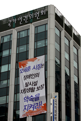 “이 논리에 대해 우리는 그런 조건들이 구체적으로 어떤 수치로 갖춰져야지 만이 장애인이 시설에서 나올 수 있느냐고 오 시장에게 물었다. 그에 대한 답을 오 시장은 하지 못했다. 결국 오 시장이 말한 조건들은 지금 시설에서 나오는 장애인들을 앞으로도 몇 십 년 동안 시설에서 못 나오게 할 수 있는 조건들일 뿐이다.”
