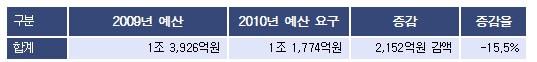 노동부가 조승수 진보신당 의원에게 제출한 자료에 따르면 2010년 노동부 예산은 1조 1,224억원으로 2009년 1조 3,926억원에 비해 총 2,152억원 삭감된다.