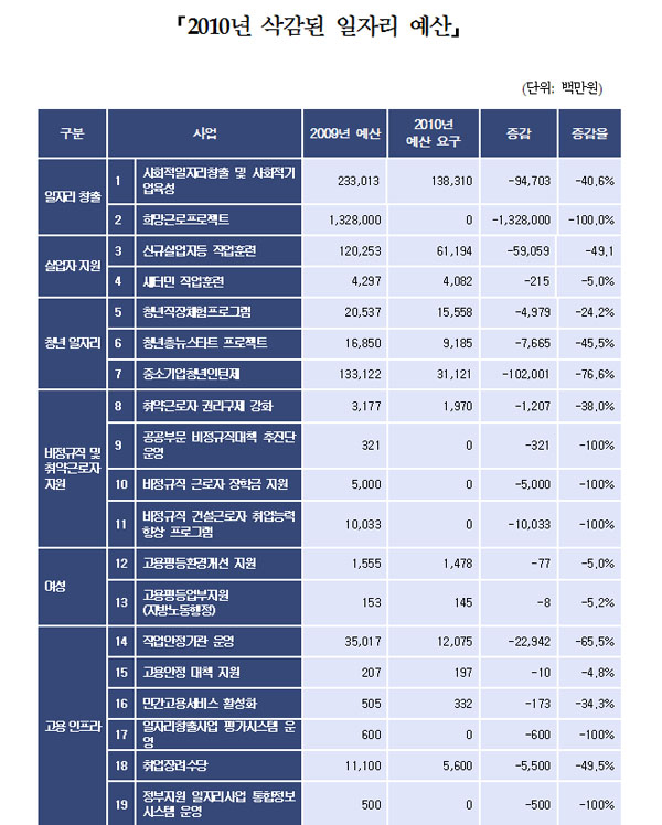 무엇보다 2010년 노동부 소관 사회적 일자리, 청년 일자리, 비정규직 지원, 여성고용평등 예산 등이 줄줄이 삭감된 것으로 나타났다. 정부가 올해 상반기 내내 비정규직 100만 해고를 주장하며 고용안정을 외쳤던 것을 생각하면 노동부 예산 삭감은 모순적이다. 또 희망근로, 청년인턴제 등 단기적 일자리 대책이 끝나면 내년 고용사정은 올해보다 더 어려울 수도 있어 정부의 일자리 대책 의지가 의심된다.