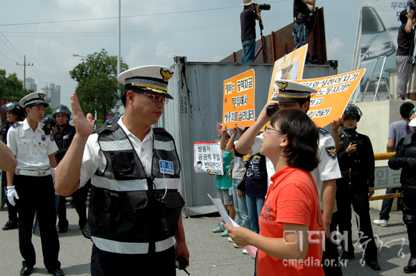 | 경찰은 파업 노동자들의 가족이 기자회견 중 정문에서 피켓을 드는 것 조차 방해했다. |