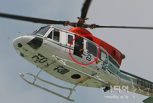 | 경찰은 기자회견이 시작 되기 전부터 헬기로 최루액을 떨어뜨리기 시작했다. |
