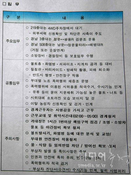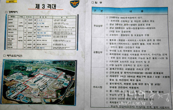 | ‘미디어충청’이 입수한 ‘임무카드’는 경기 남북부 지역으로 편성된 제 3격대 소속의 임무가 경력배치, 배치요도(야간), 임무 등으로 자세히 서술되어 있다. | ||