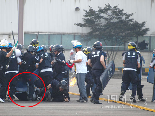 | 집단 구타중인 용역과 경찰, 운동화와 군홧발 밑에 깔려 있는 노동자는 이미 아무런 저항도 할 수 없는 상황이었다. 가운데 흰티 입은 용역이 방패를 들고 있다.좌측 끝 쇠파이프를 든 용역/사진제공 사자후 | ||