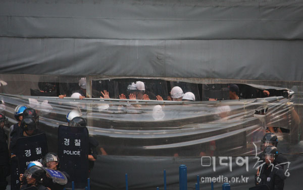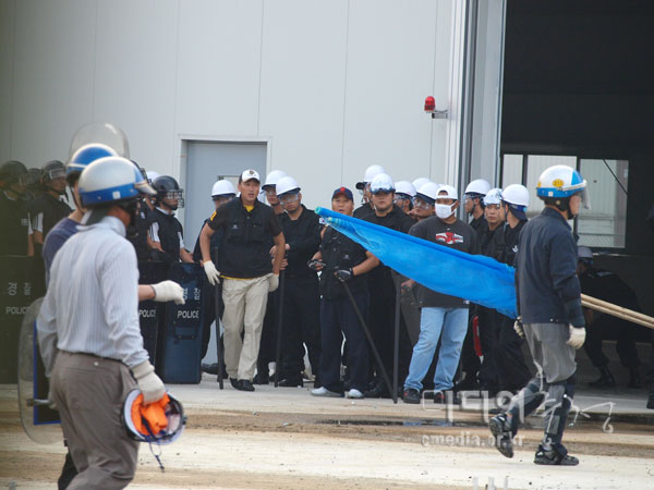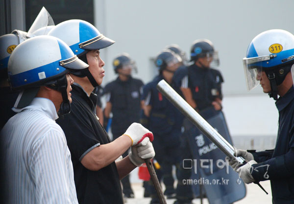 | 하얀 헬멧의 용역과 앞에 검을 헬멧, 방패를 든 경찰이 같이 있다. 경찰과 용역은 '합동작전'을 펼치며 프레스공장으로 진입했다. | ||