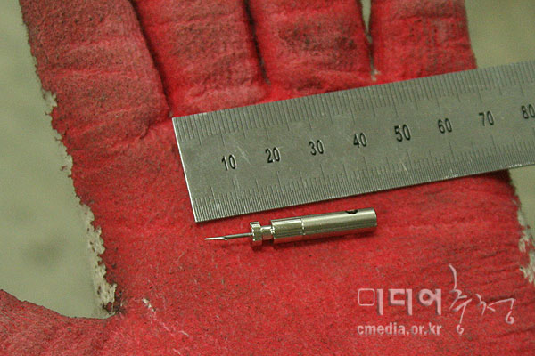 “얼굴에 전기가 오는 것처럼 찌릿찌릿하다. 안에 뭐가 펴져서 걸린 것 같다.”고 했다. 쇠붙이 위에 붙은 바늘은 마치 낚싯바늘처럼 갈고리 모양으로 한쪽이 돌출되어 있다.