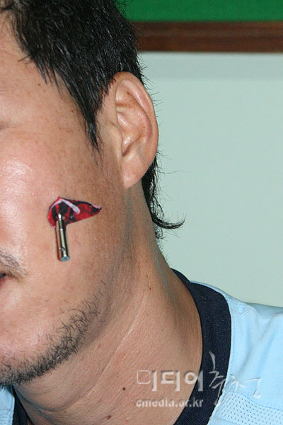 쌍용차 노동자가 경찰이 쏜 길이 4cm가량, 지름 0.5cm가량의 총알모양의 화살촉에 얼굴을 맞아 충격을 주고 있다. 이 노동자는 22일 저녁 6시20분께 정문에서 화살촉에 맞고 저녁7시10분경께 복지동으로 이송됐으나 아직 치료를 받지 못하고 있다. 그는 현재 볼에 화살촉이 박힌 채 의료진을 기다리고 있다.