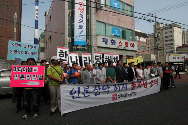 22일 오후4시 한나라당 울산시당 앞 전국언론노동조합 울산언론노조협의회의 기자회견이 미디어법이 국회에 직권상정돼 한나라당의 찬성표로 통과 처리 됐다는 소식과 함께 시작됐다.