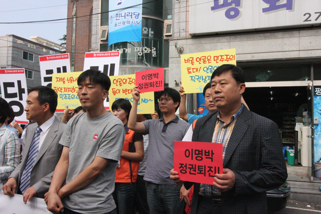 또 "그동안 지상파방송은 공적소유 개념을 도입하고 사회적 합의로 방송을 독립, 정치권력과 자본으로부터 독과점을 막아왔는데 대통령 한번 잘못 뽑아서 하루아침에 미디어악법, 노동악법 등을 총망라해 각 분야의 MB악법이 정권의 만행으로 들어서고 있다"며 울산에서도 민주노총울산본부와 제정당 시민사회단체와 함께 대정부 투쟁을 해나갈 것이라고 밝혔다.