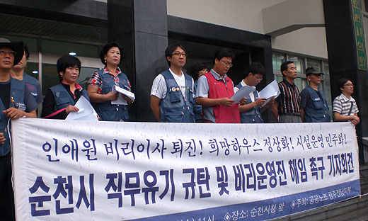 이와 관련, 전국공공서비스노조 광주전남지부(지부장 전욱)는 15일 오전 순천시청 앞에서 기자회견을 열어 “희망하우스 정상화”와 “비리운영진 해임”을 요구하는 한편 “순천시의 직무유기”를 규탄했다.