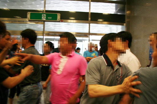 | 광주광역시 농아인협회장 취임식이 열린 16일 5·18기념문화관 앞에서 협회와 대책위관계자들 간의 몸싸움이 벌어졌다. | ||