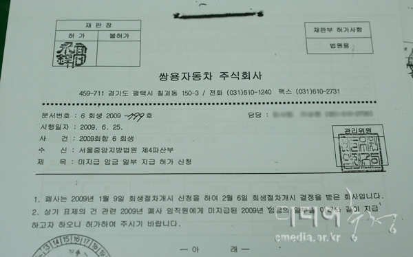 지난 6월 쌍용차는 박영태, 이유일 공동관리인 ‘6월 급여 26,882,000원과 재직자 급여 3월 분 50% 지급’ 등을 법원에 신청하였다.