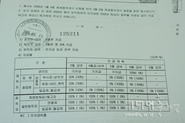 노조 관계자는 "대량의 정리해고를 하고 또 한쪽에서는 임금 삭감을 요구하며 정작 자신은 매달 한푼의 체불도 없이 임금을 다 받아갔다는 건 경영책임자의 자세가 안돼 있다 볼 수 밖에 없다"고 말했다.