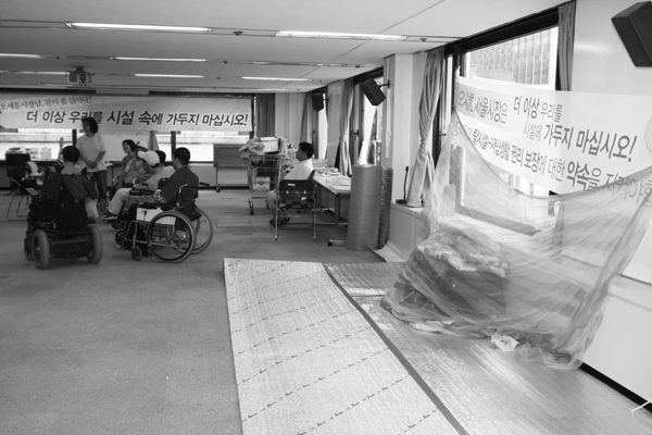 | ▲ 국가인권위원회 11층 배움터에서 점거농성을 벌이고 있는 탈시설공투단 모습 ⓒ전진호 기자 | ||