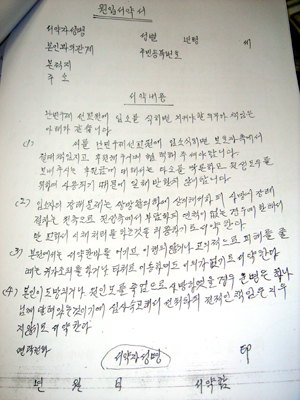 | 시설 입소 계약서대신 체결하고 있는 원입서약서. 계약서라기 보다 귀책사유에 대한 이의제기 방지를 위한 서약서로 보인다. | ||