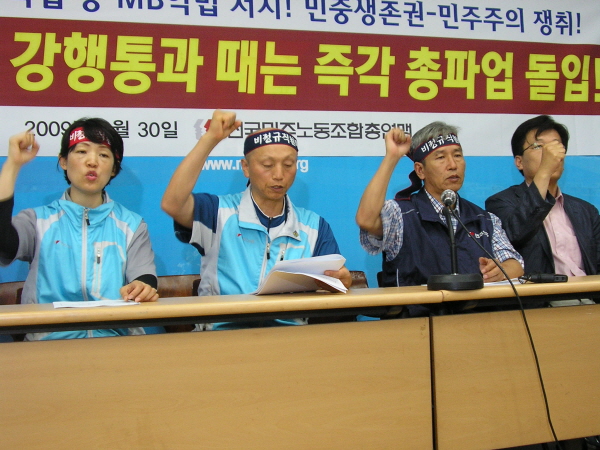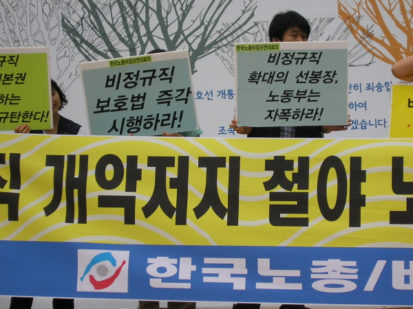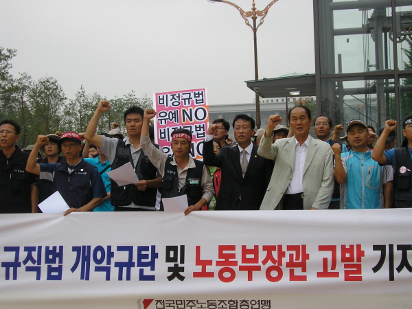 민주노총은 30일 오전 10시 민주노총 1층 회의실에서 기자회견을 갖고 “시행유예를 골자로 한 비정규악법이 어떤 형태로든 국회 본회의에 상정될 경우 즉시 총파업에 돌입할 것”을 선언했다. 민주노총은 대량해고설로 비정규직 노동자들이 피해를 받았다며 이영희 노동부 장관을 서울남부지검에 고발하기도 했다.