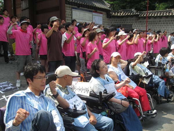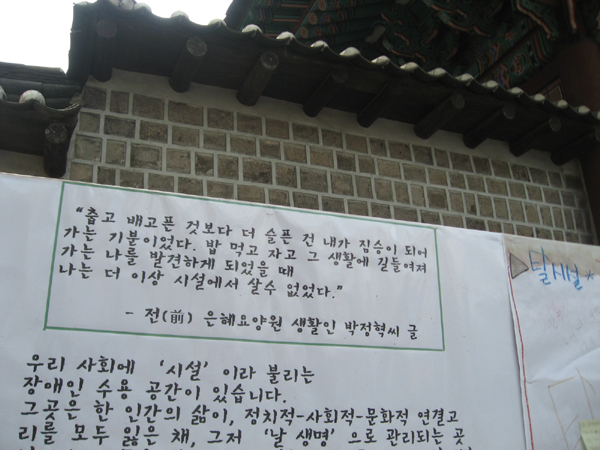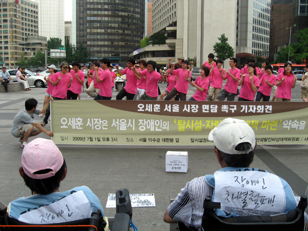 최석윤 성북장애인자립생활센터 사무국장은 “이명박 정부와 오세훈 시장은 한강 르네상스를 일으키겠다며 지은 지 4년밖에 되지 않는 아파트를 허물고, 부자들 세금을 감면하는데 엄청난 액수를 쏟아 부었다. 이명박 정권 초기에도 능동적 복지로 장애 패러다임을 바꾸겠다고 했지만, 장애 패러다임은 더 악화되었고 장애 인권은 유린당하고 있다.”고 말했다.