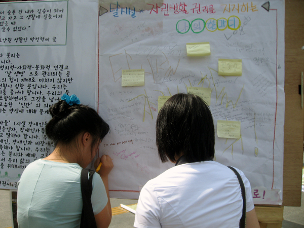 | ▲ 지나가던 여학생 두 명이 탈시설권리 쟁취 응원 메시지를 적고 있다.ⓒ김태현 기자 | ||