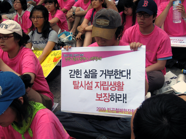 참가단의 한 학생은 “사회복지시설들은 서로 간에 족벌처럼 연결되어 있어서 장애인들을 가두고 마치 자기들끼리 땅따먹기를 하듯이 세습과 유착이 만연하게 만들고 있다. 그런 시설 비리를 없애는 것도 중요하지만 더 중요한 건 탈시설 권리라고 생각한다. 인간의 가장 큰 권리는 자기 결정권이다. 지금의 시설들은 장애인들을 감금하고 사회에서 배재시키고 그들을 사회적으로 더 적응하기 어렵게 만들고 있으며, 오세훈 시장과 이명박 정권은 그에 동조하고 있다. 앞으로도 빈곤철폐현장활동은 며칠간 서울 곳곳을 돌아다니며 빈곤과 억압, 차별로 고통 받는 이들과 함께 하며 이런 사회적인 문제들의 구조를 찾아내려고 한다.”고 주장해 호응을 얻어냈다.