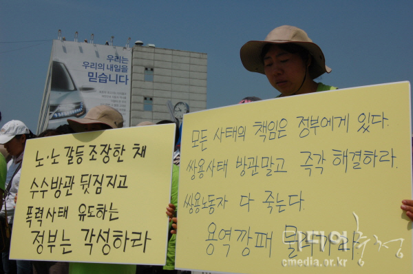 상하이는 기술도둑질, 산업은행은 방조, 지식경제부는 기술관리 부실, 검찰수사는 오리무중, 법원은 조사보고서를 통해 상하이 중대한 경영부실 책임 없다고 면죄부, 그리고 정부는 뼈를 깎으라는 주문만 외치고, 드디어 행동대원으로 용역과 깡패를 동원한 관리자들의 몸부림. 결국 쌍용차의 모든 문제는 “지들끼리 치고 박고 싸우는 집안싸움 때문”이라는 프레임을 통해 대한민국 정부는 사라지고 말았다. 이런 정부에게 회사는 공권력 투입을 요청하고, 노조는 공적자금 투입을 요청하는 엇갈리는 길을 계속 간다면 도대체 무슨 비전이고 희망이 있을까?