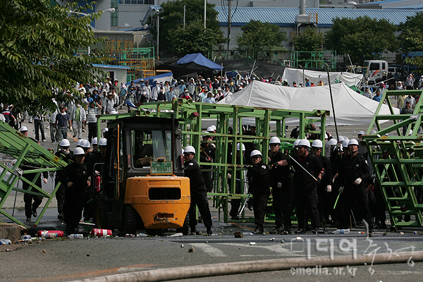 | 쇠파이프를 들고 바리케이트를 치우며 진입해 들어오는 용역 | ||